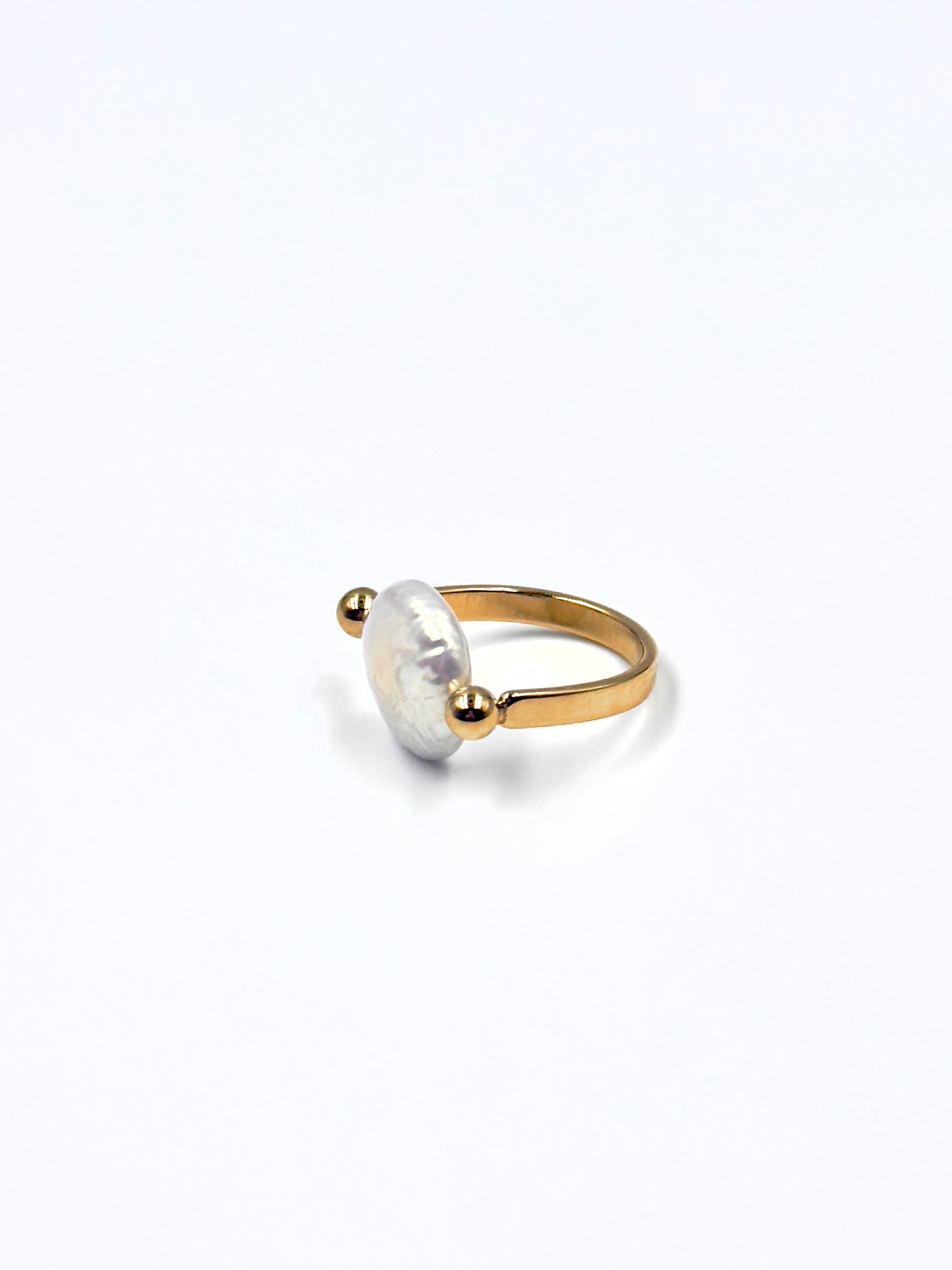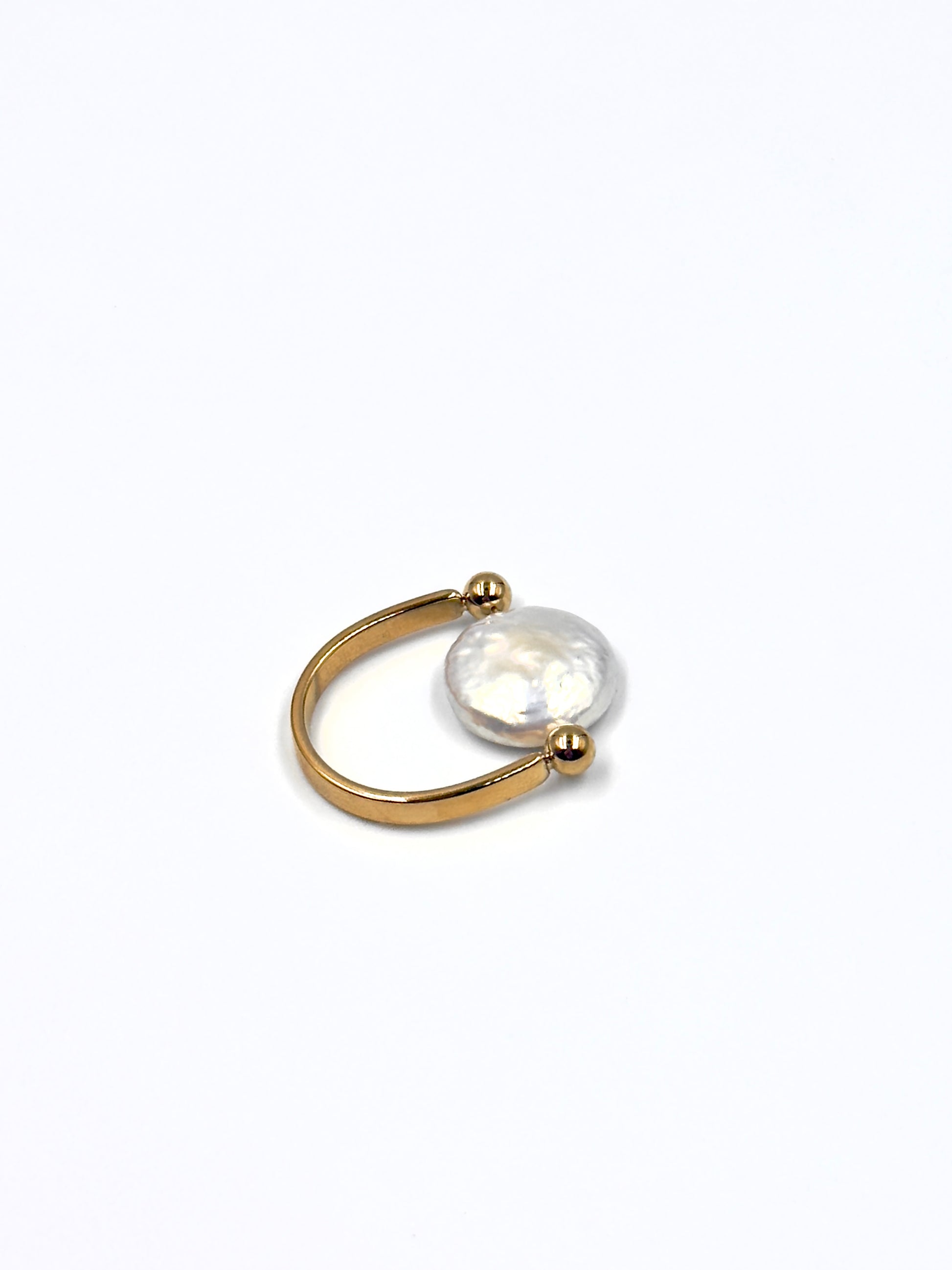 The Lunea features a luminous freshwater coin pearl, suspended between two golden spheres on an open, adjustable band. A minimalist yet magical piece, perfect for layering or wearing solo.