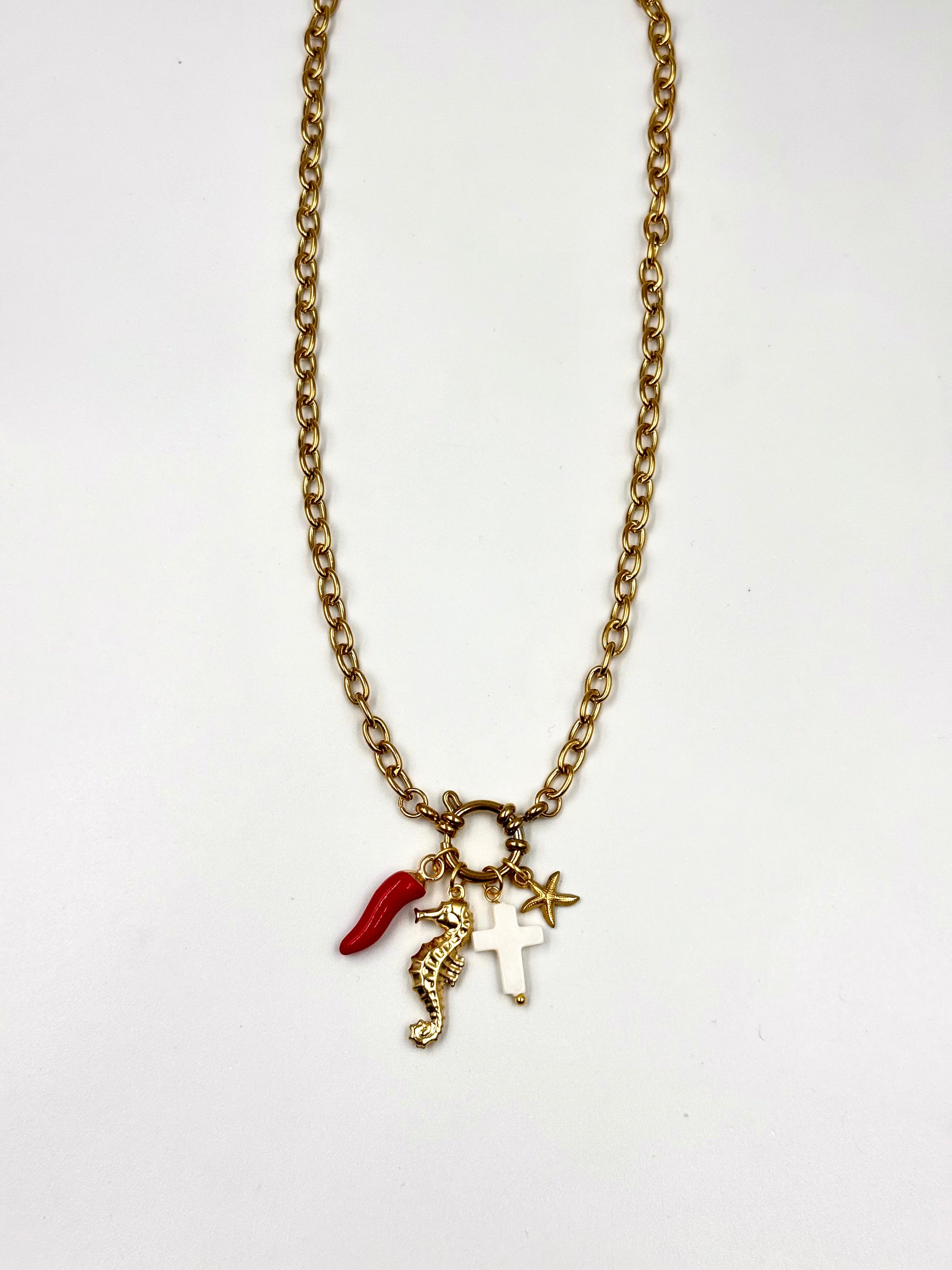At its heart lies the iconic red cornicello — a tiny chili-shaped amulet believed to protect against bad luck and attract good fortune. Paired with golden tones and delicate detailing, this necklace is a bold homage to Naples, where history, superstition, and summer heat blend effortlessly.