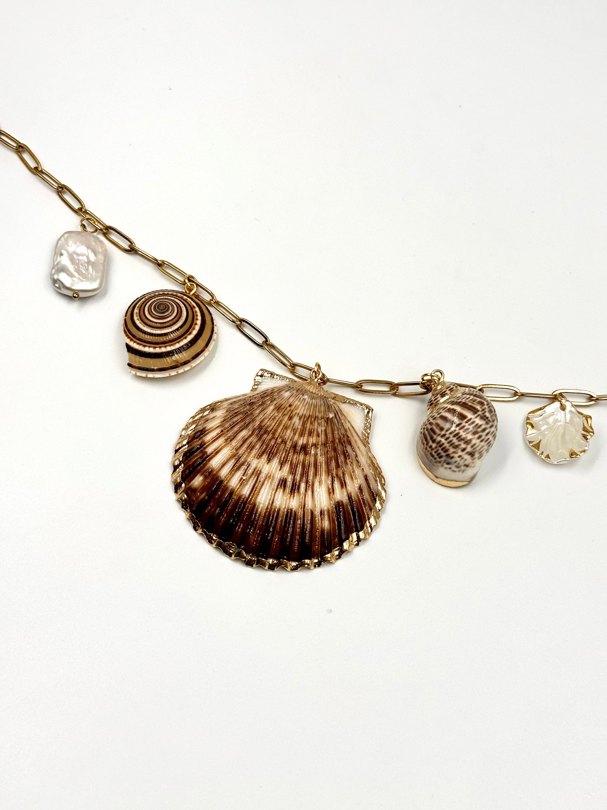 A golden shell & pearl necklace inspired by serene shores and soft sunlight.