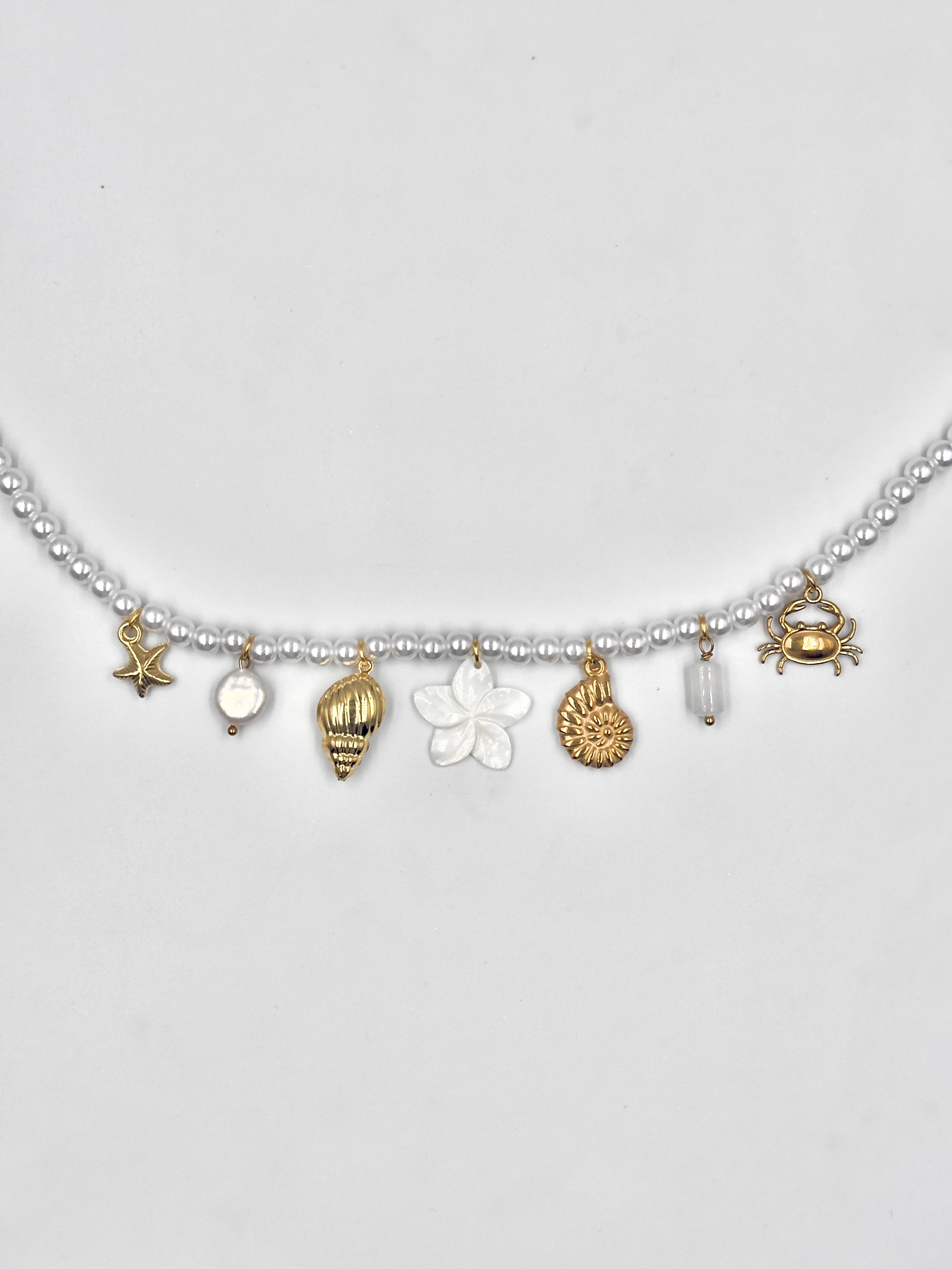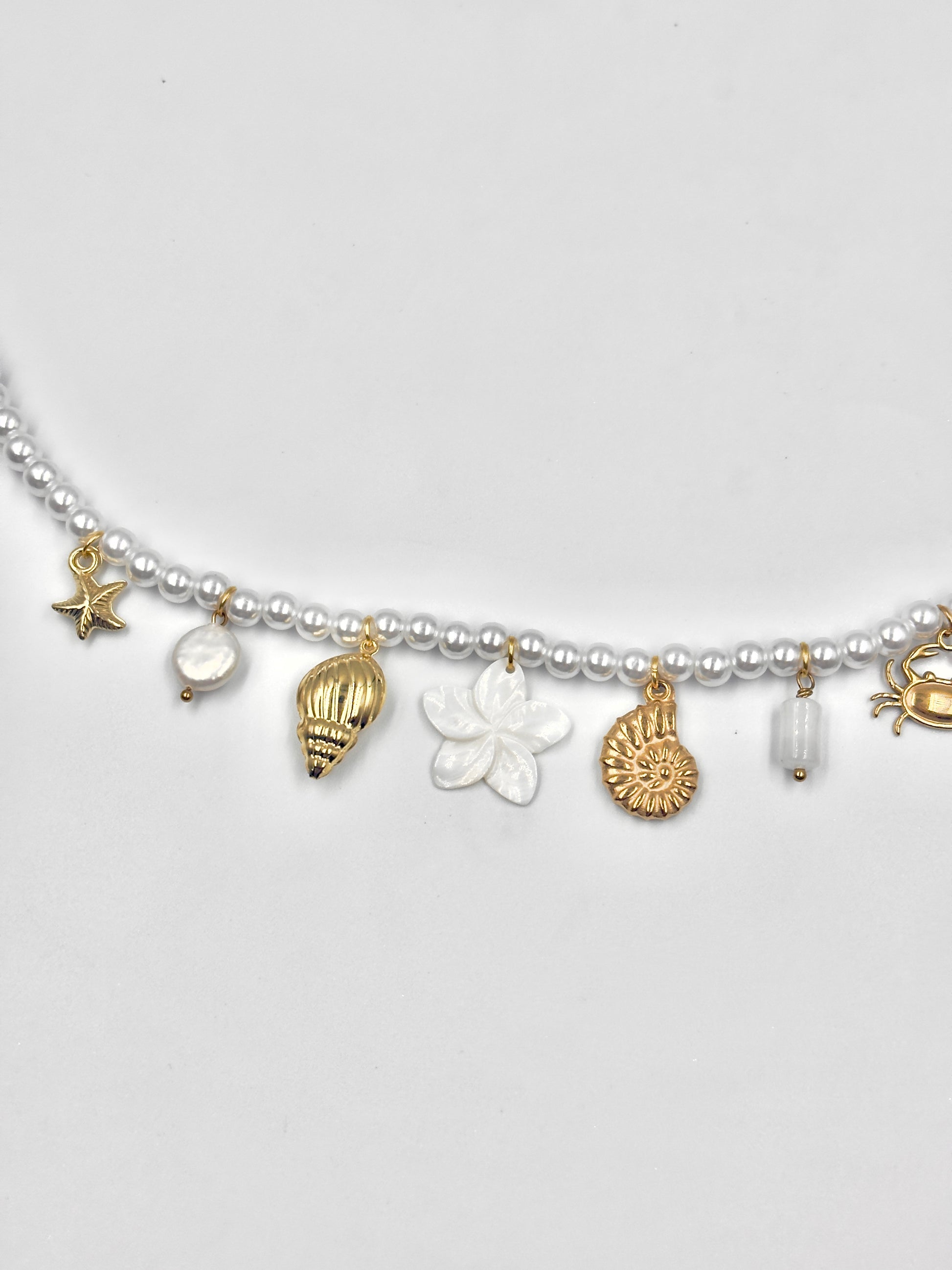 The Coastal Pearl features a string of luminous pearls adorned with seven golden and pearly charms — from a delicate flower to a glistening shell and a playful crab. Each charm whispers stories of warm tides and sun-soaked shores.