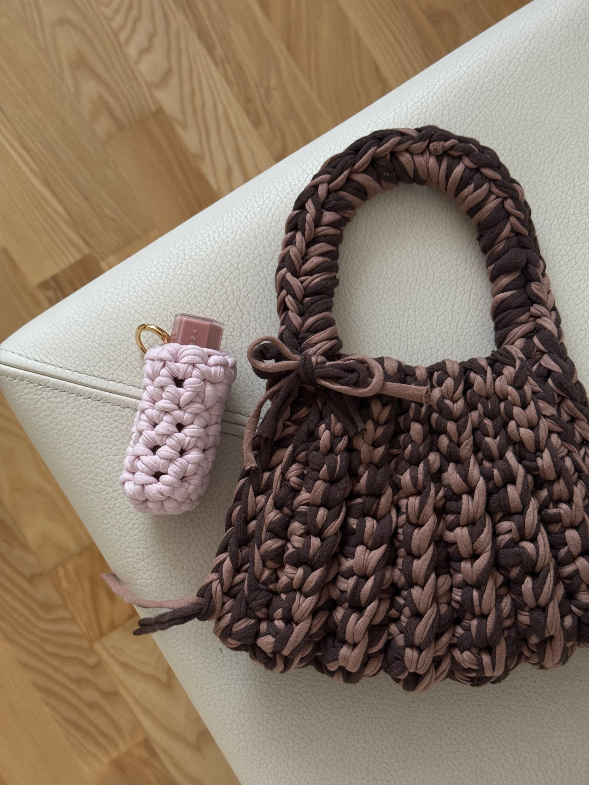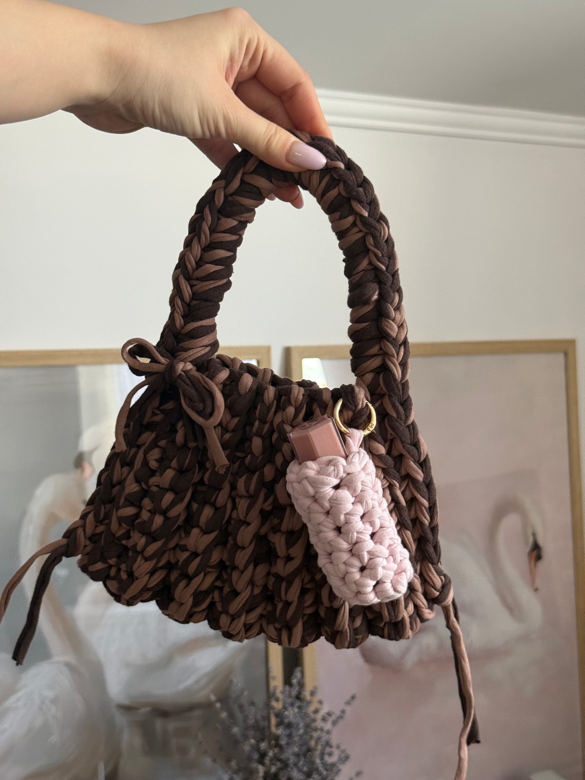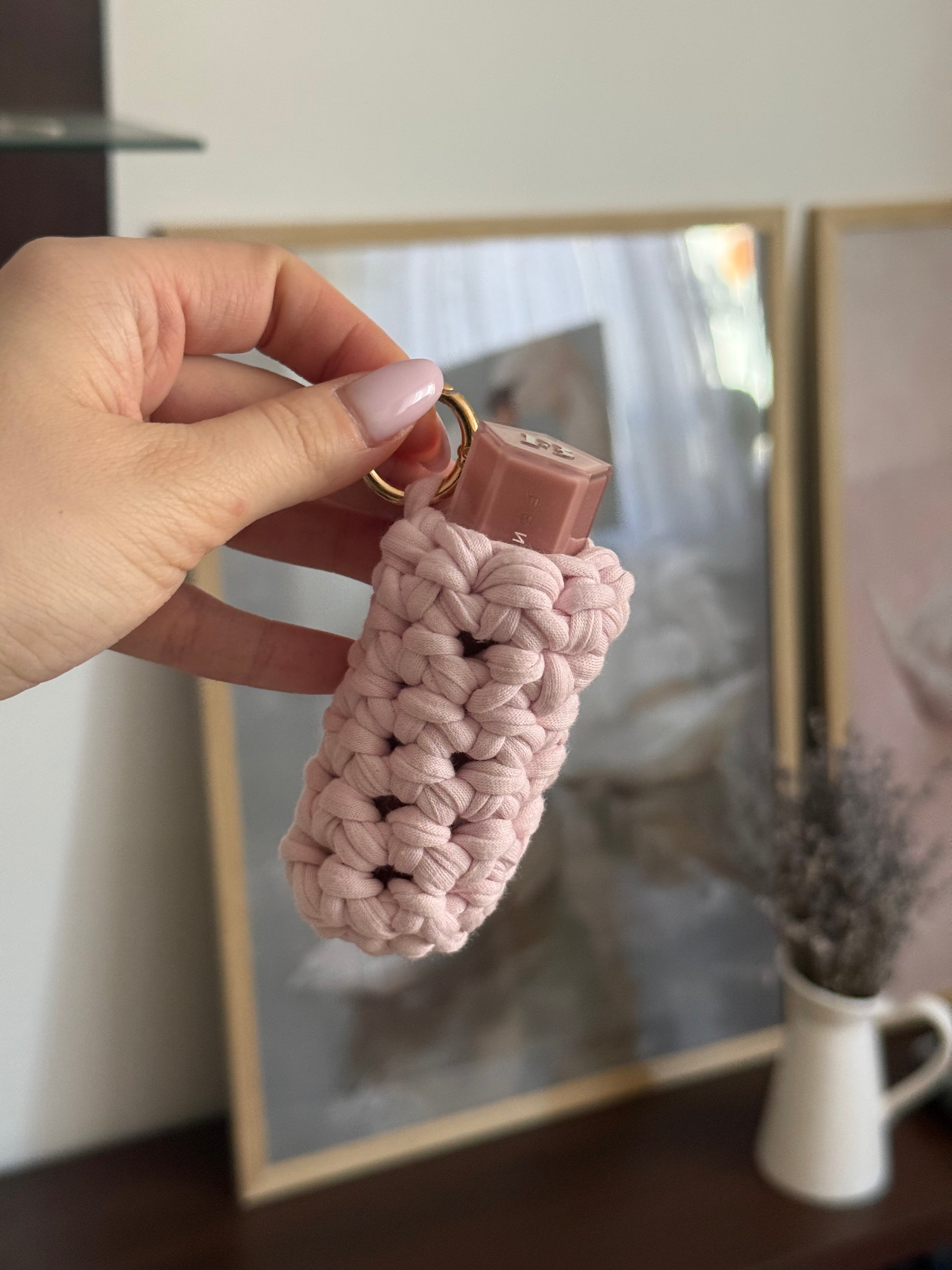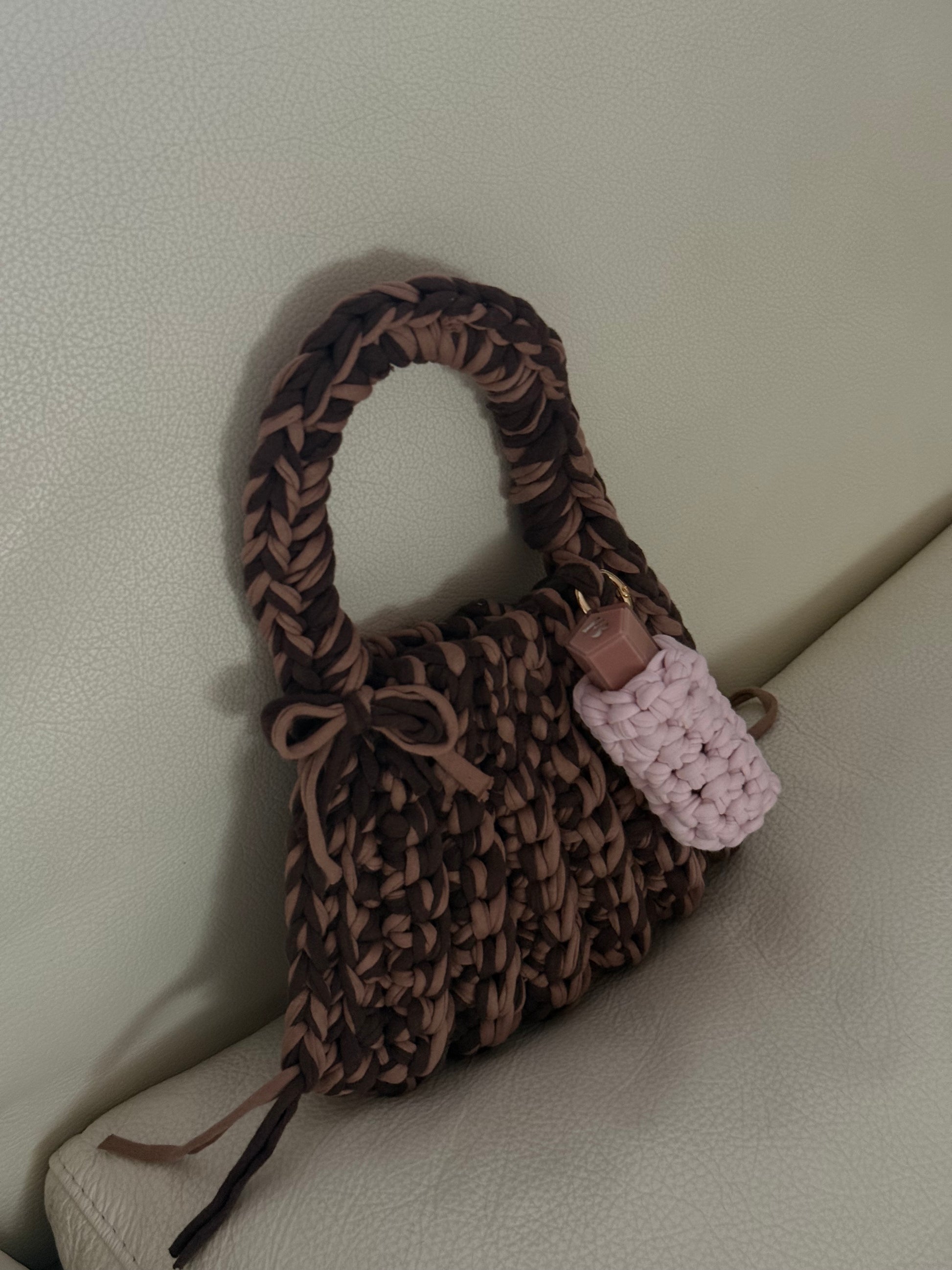 Hand-crocheted and made to clip onto your bag, The Lip Shell keeps your essentials close — lipstick, gloss, small treasures.