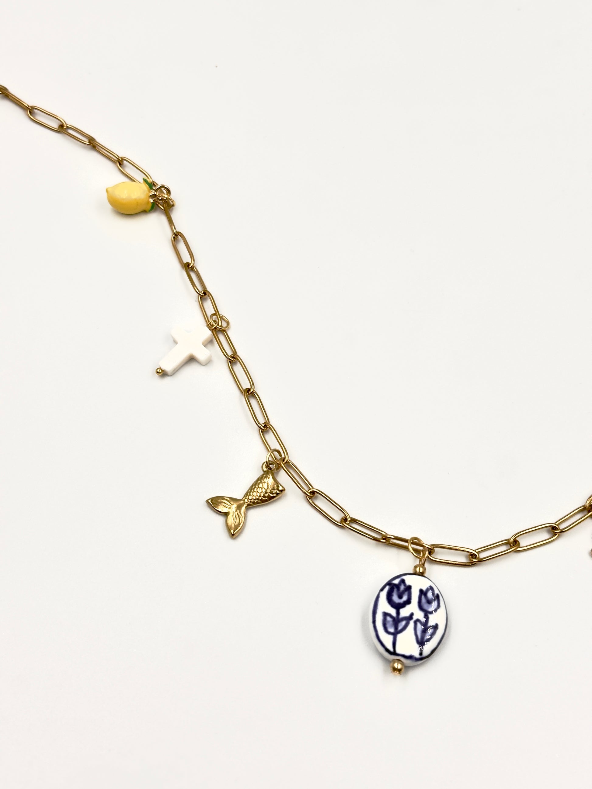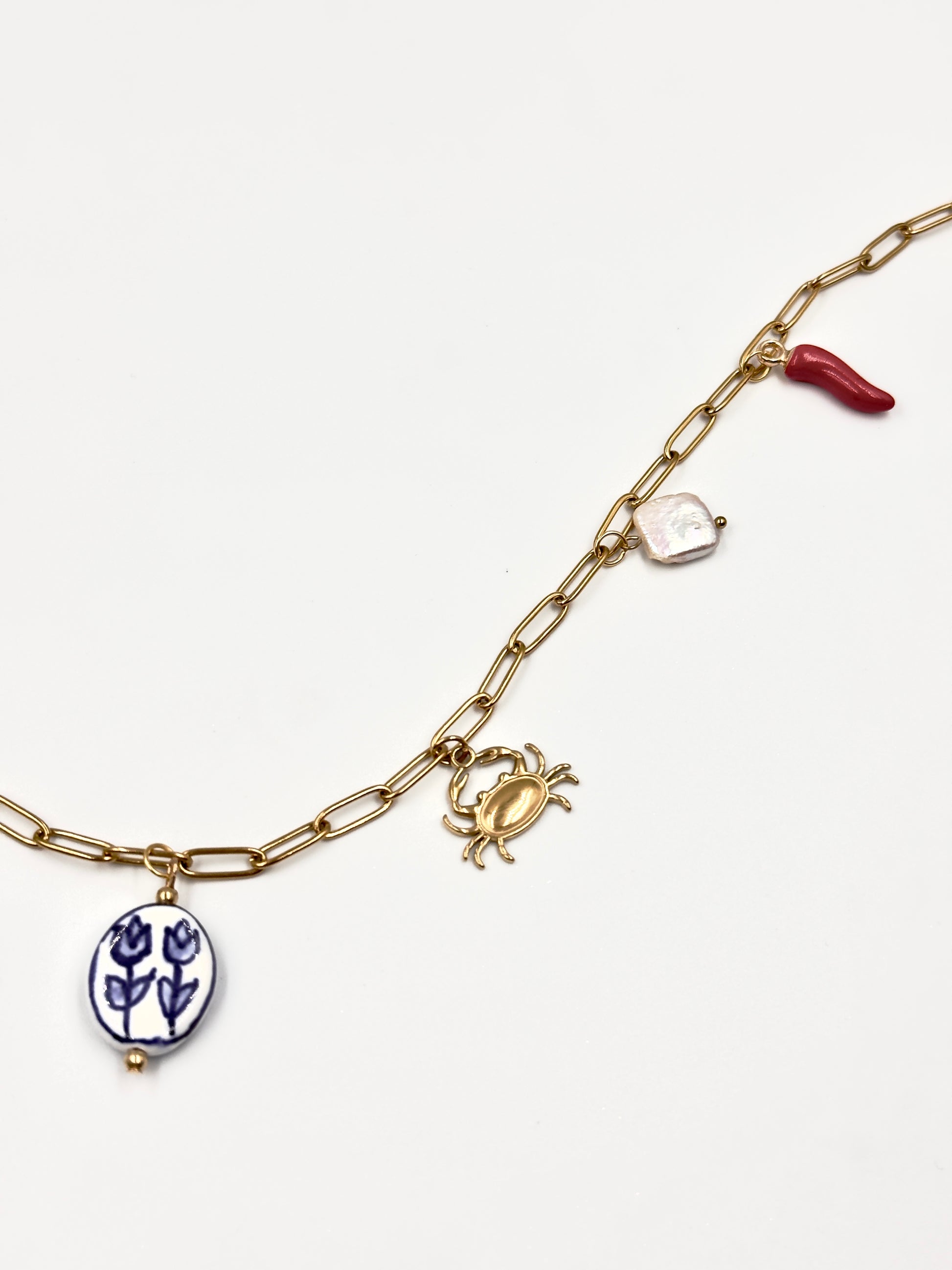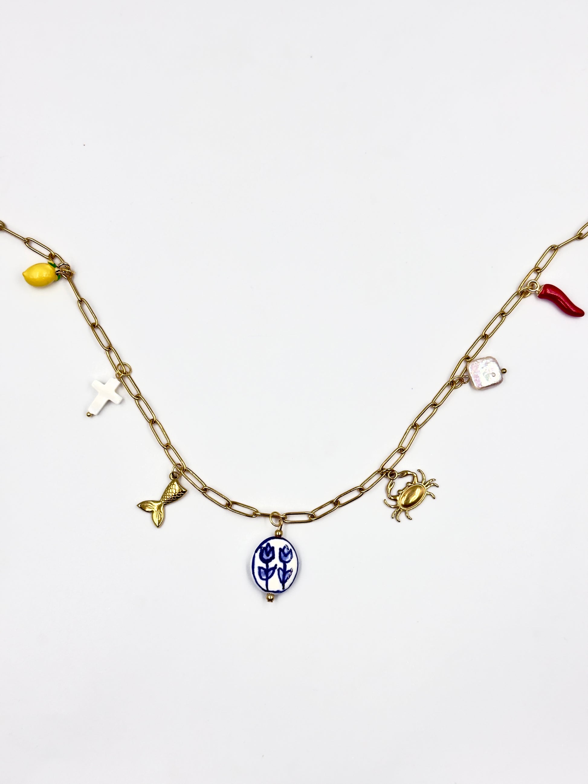 The Siciliana features a bold gold-tone chain adorned with seven symbolic charms — from a hand-painted ceramic medallion and a golden crab to a juicy lemon, a lucky peperoncino, a mermaid fin, and a delicate cross of faith.