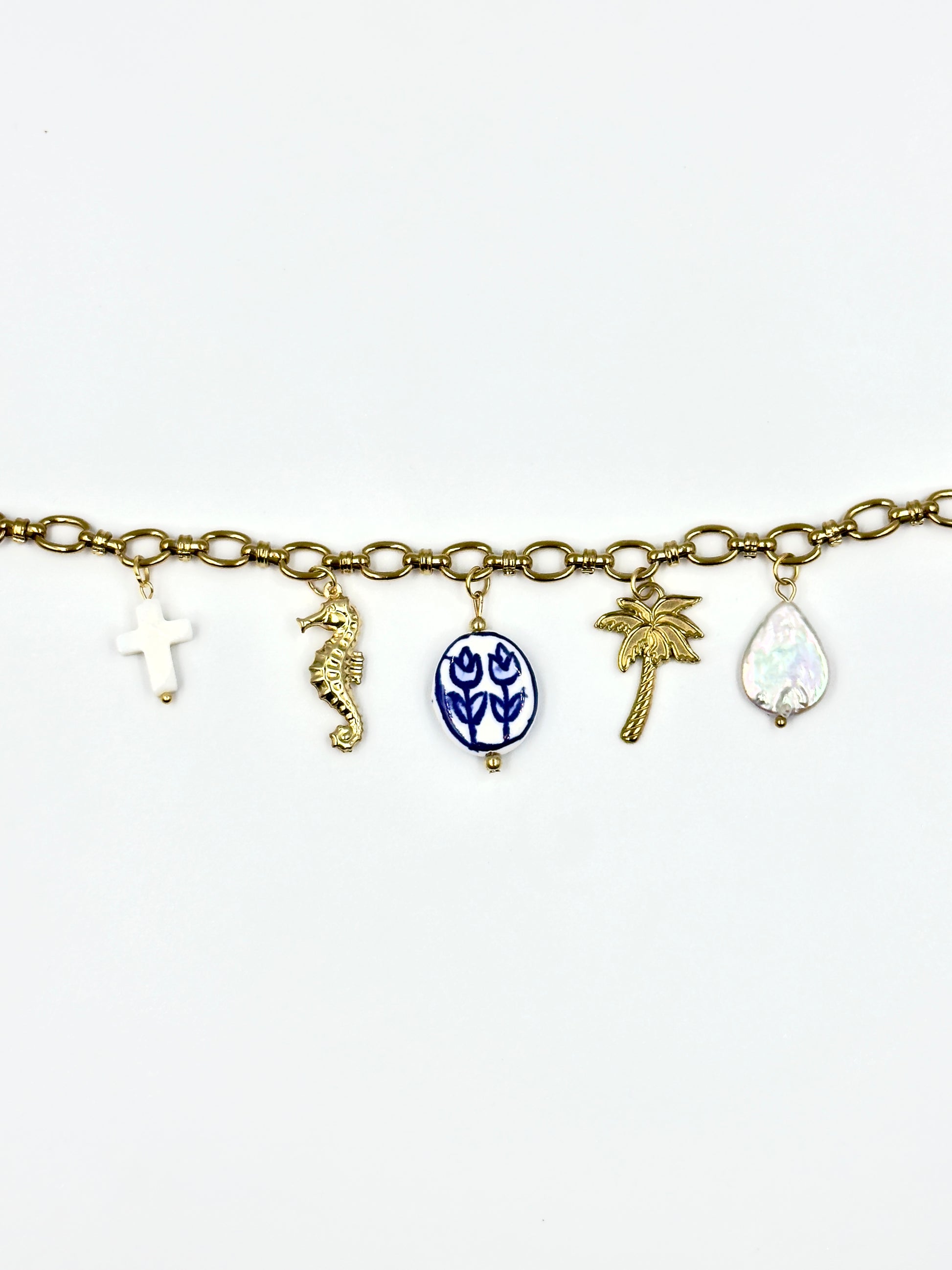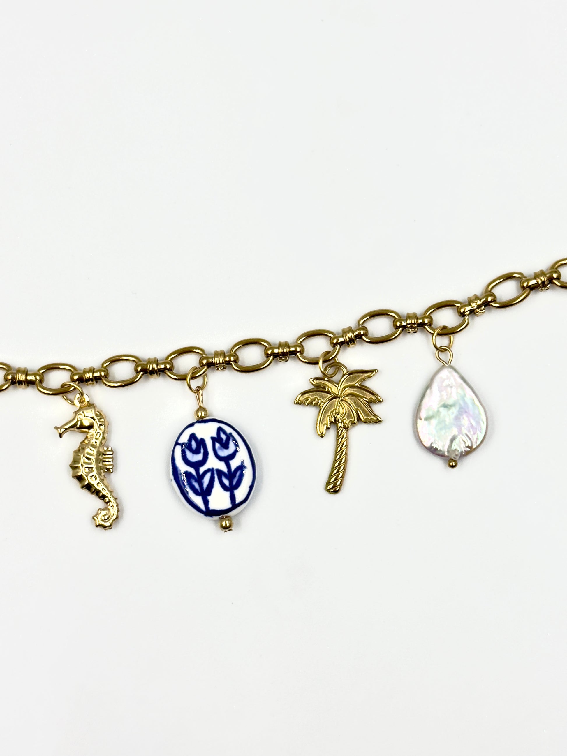 The Soléa is a gold-tone bracelet adorned with five radiant accents — a hand-painted ceramic charm, a freshwater pearl drop, and playful symbols like a palm tree and a seahorse. Each detail tells a story of sunny shores and peaceful escapes.